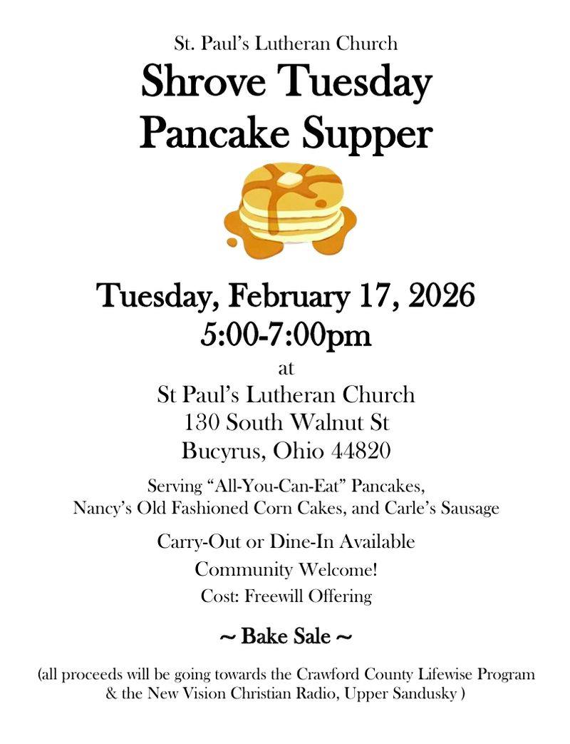 The St Paul's Shrove Tuesday Pancake Supper will be Tuesday, February 17, 2026, 5-7pm. Please watch for sign-up sheets on the wooden table in the back of the sanctuary for food donations, and for helping out with preparations, cooking, serving, and clean-up.